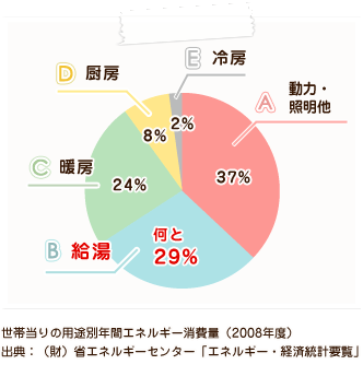 このグラフは、省エネ行動診断(JX日鉱日石エネルギー) さんから引用したものですが、我々の生活の中で、給湯にはエネルギーの約 1/3 弱が使われているわけですね。